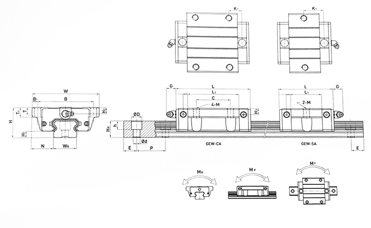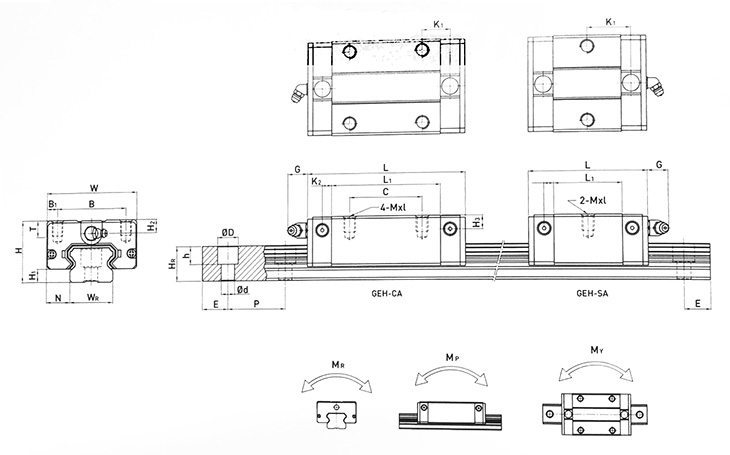 H H1 N W B B1 C L1 L K1 G M×L T H2 H3 WR HR D h d P E mm C(kN) C0(kN) MR MP MY